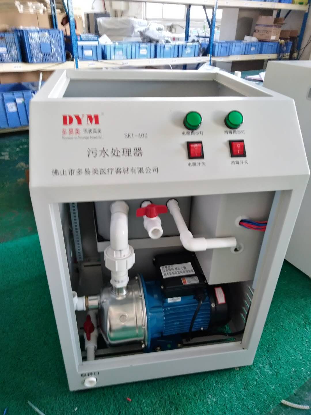 多易美污水处理设备:采用金属材料,通过臭氧灭菌,灭菌时间1min(大肠杆菌灭菌99%),外形尺寸是:480*420*650mm,执行标准:GB18466-2005国家医疗机构污水排放预处理标准,满足您新开业,重新装修诊所验收的标准