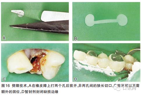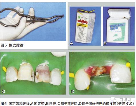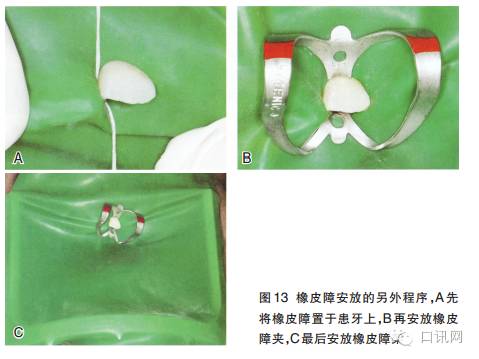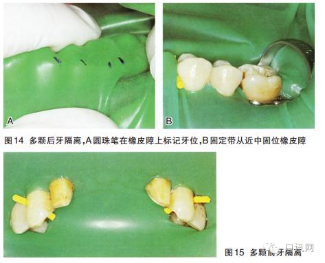 ③用橡皮障钳安放好橡皮障夹,然后将橡皮障压入邻接区之间来隔离患牙口腔临床执业医师。可用橡皮障固定带从近中固位橡皮障(图14B)口腔医学技术。橡皮障架可最后安放口腔修复工艺。