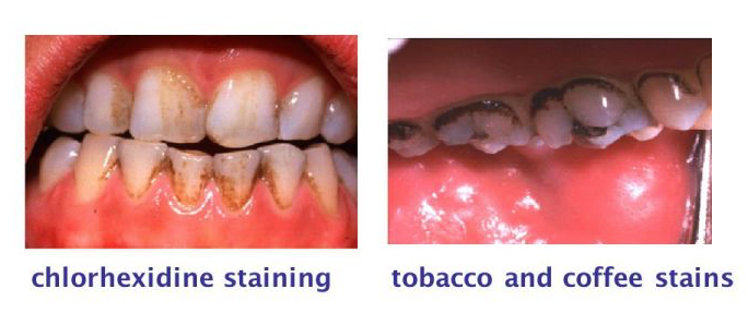 这种的不建议长期使用,长期使用会导致口腔内菌群失调口腔临床执业医师。像含氯己定(洗必泰)成分的漱口水不适合长期使用,食物中的色素可能与牙齿上的氯己定结合,产生牙面的色素沉着,或会出现舌苔变黑的情况口腔医学技术。下图左使用氯己定对牙齿产生的色素沉积